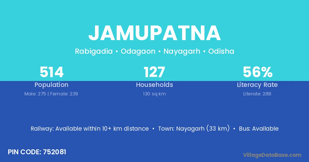 Nayagarh (33 km) is the nearest town to Jamupatna village for major economic activities and is located approximately 33 km away.