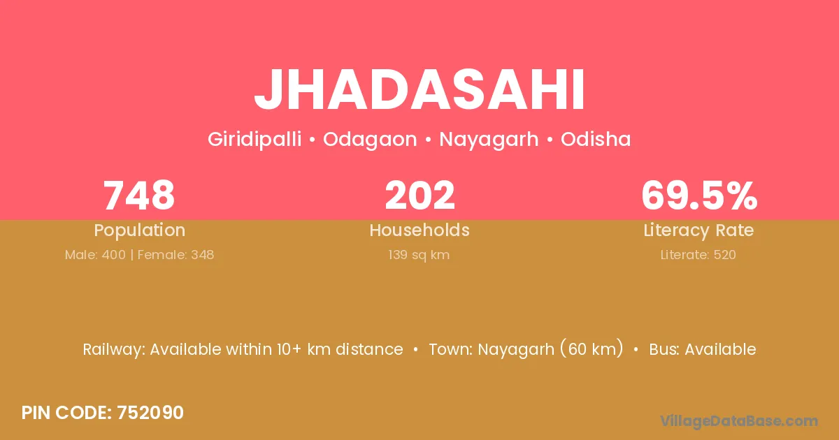 Nayagarh (60 km) is the nearest town to Jhadasahi village for major economic activities and is located approximately 60 km away.