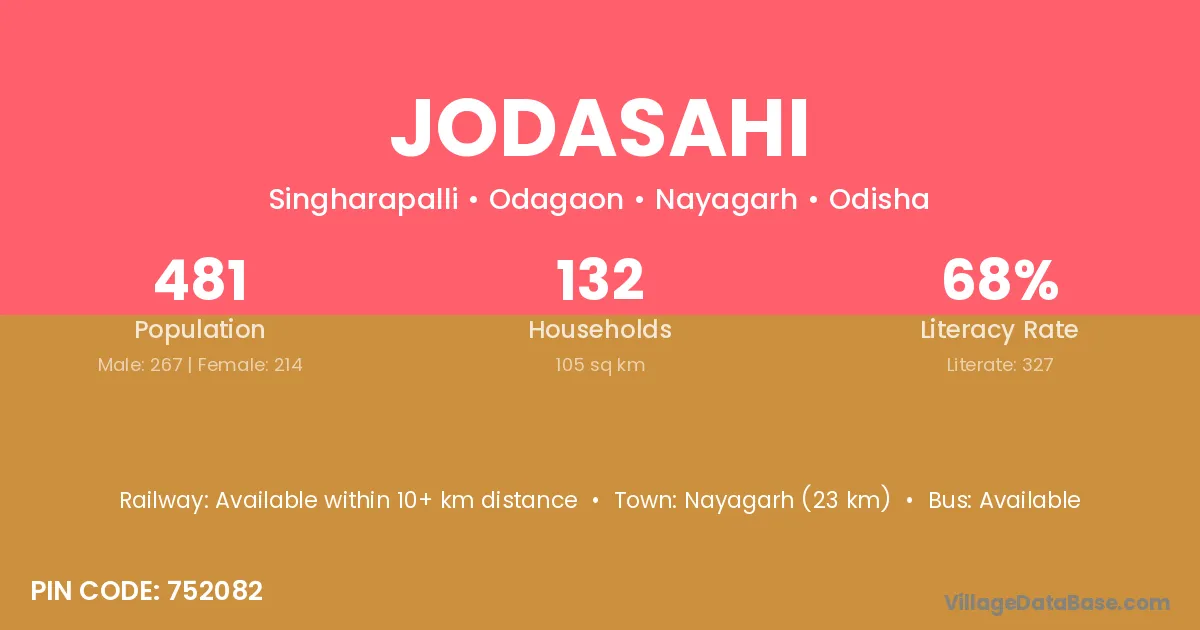 Nayagarh (23 km) is the nearest town to Jodasahi village for major economic activities and is located approximately 23 km away.