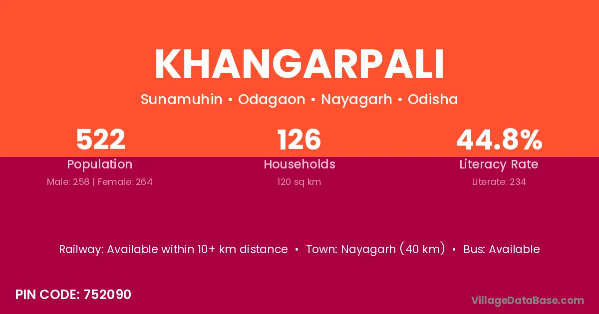 Nayagarh (40 km) is the nearest town to Khangarpali village for major economic activities and is located approximately 40 km away.