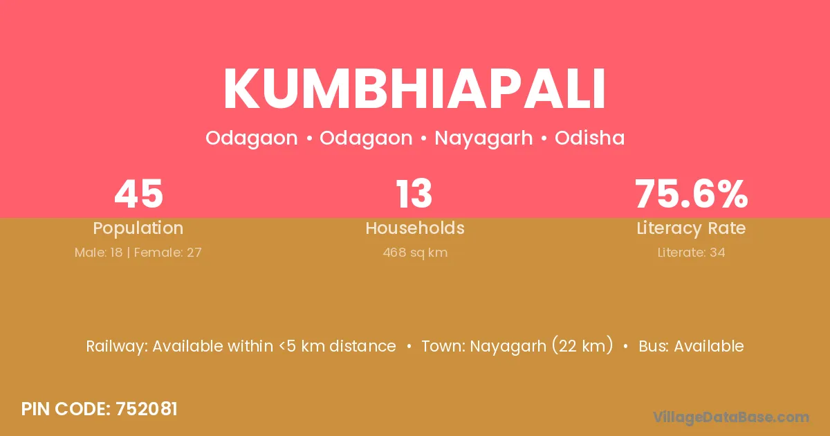 Nayagarh (22 km) is the nearest town to Kumbhiapali village for major economic activities and is located approximately 22 km away.