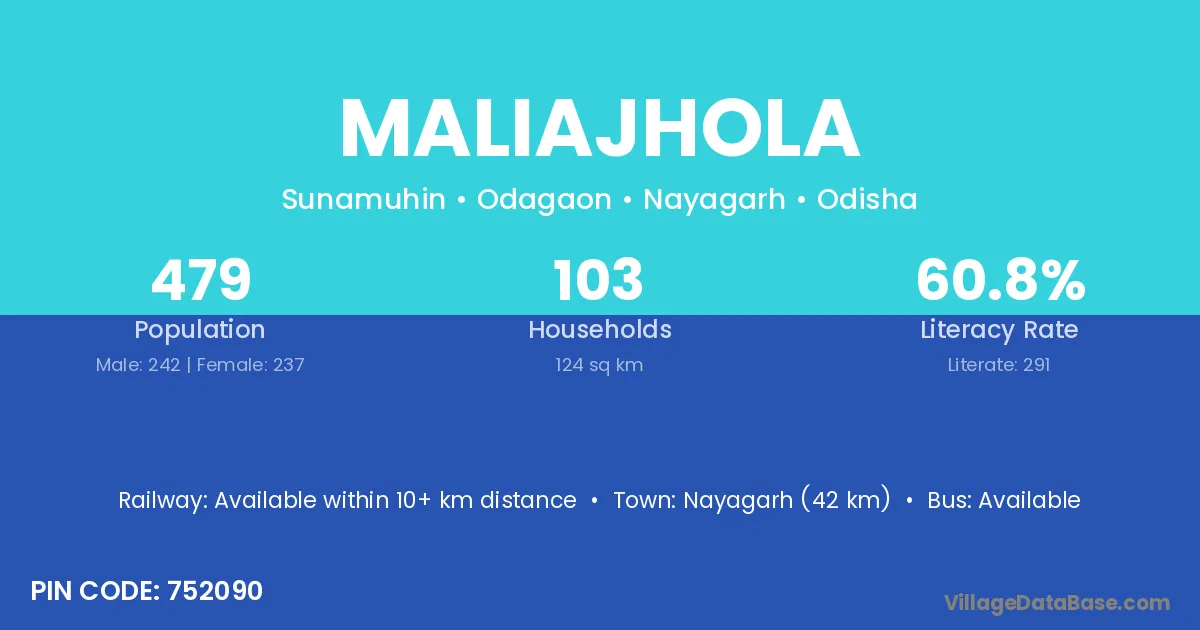 Nayagarh (42 km) is the nearest town to Maliajhola village for major economic activities and is located approximately 42 km away.