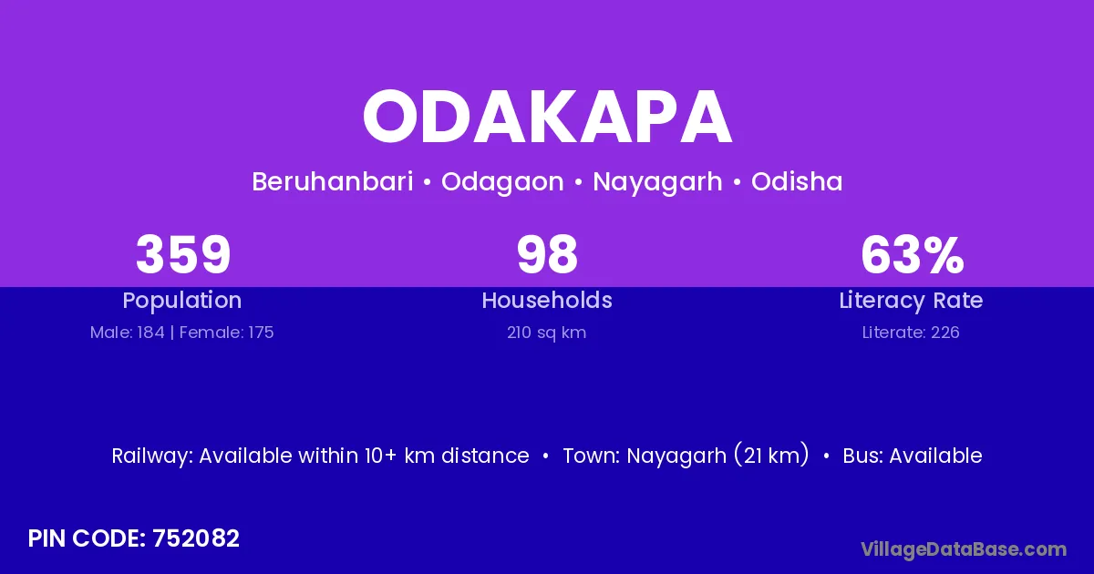 Nayagarh (21 km) is the nearest town to Odakapa village for major economic activities and is located approximately 21 km away.