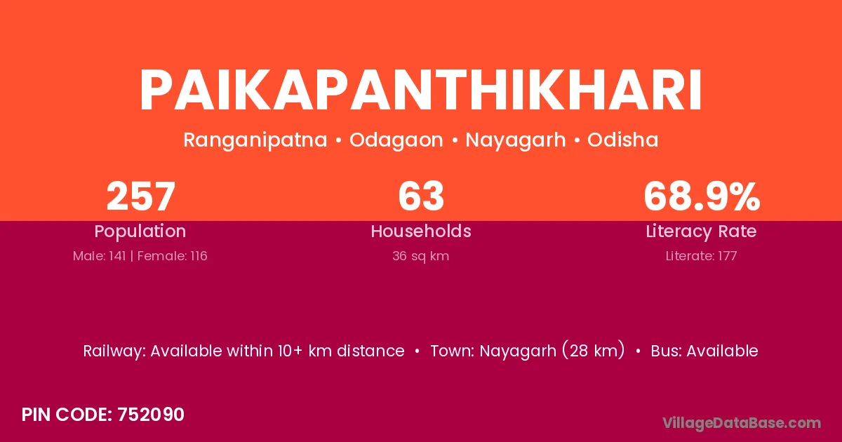 Nayagarh (28 km) is the nearest town to Paikapanthikhari village for major economic activities and is located approximately 28 km away.