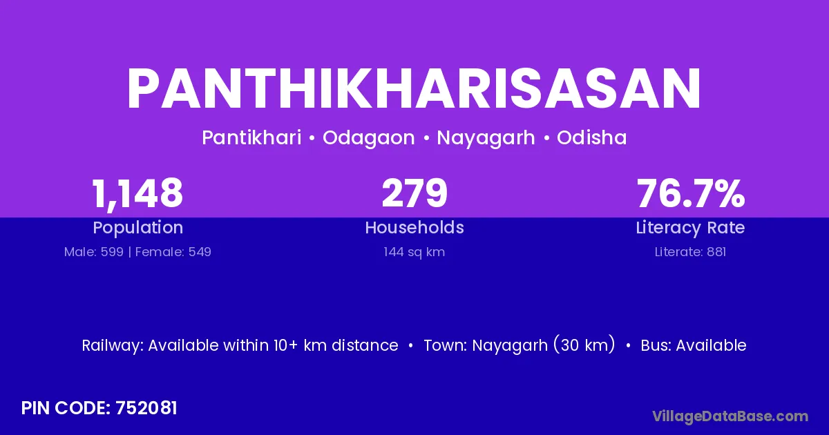 Nayagarh (30 km) is the nearest town to Panthikharisasan village for major economic activities and is located approximately 30 km away.