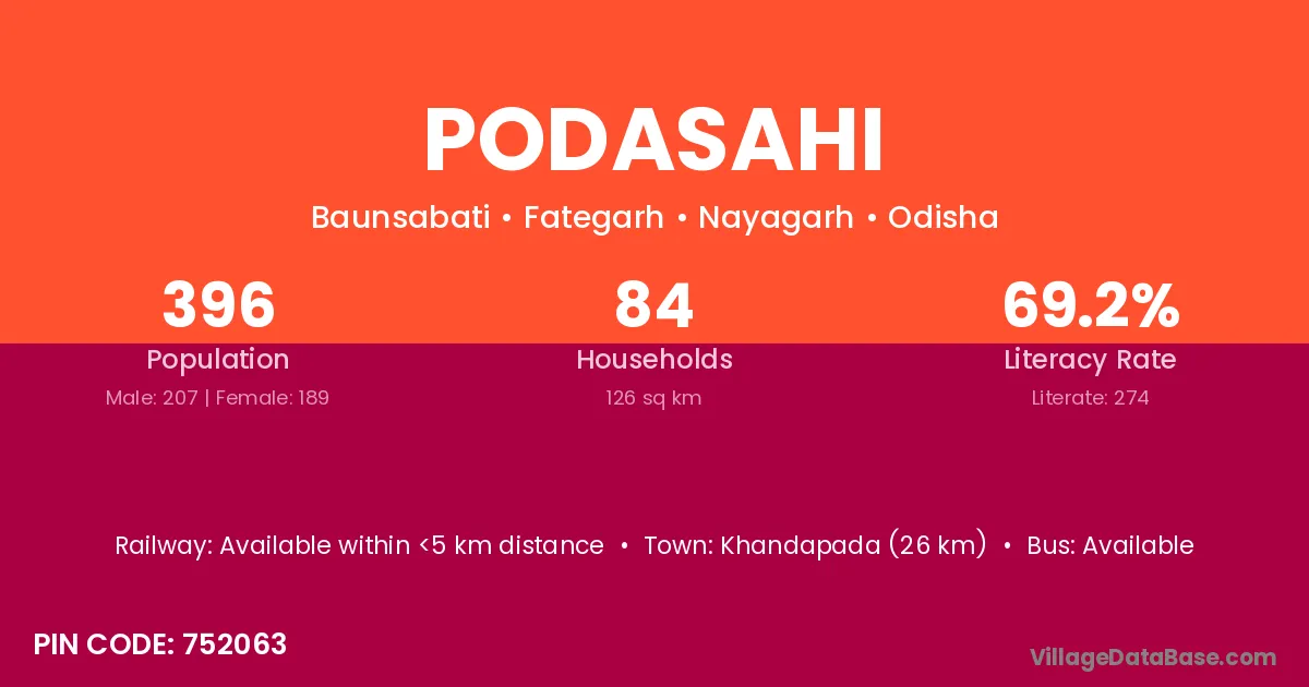 Nayagarh (40 km) is the nearest town to Podasahi village for major economic activities and is located approximately 40 km away.