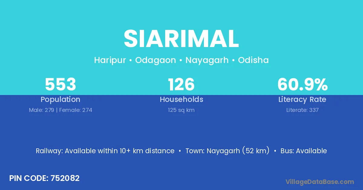 Nayagarh (52 km) is the nearest town to Siarimal village for major economic activities and is located approximately 52 km away.