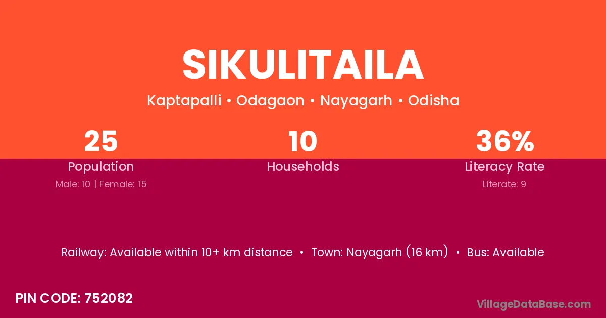 Nayagarh (16 km) is the nearest town to Sikulitaila village for major economic activities and is located approximately 16 km away.