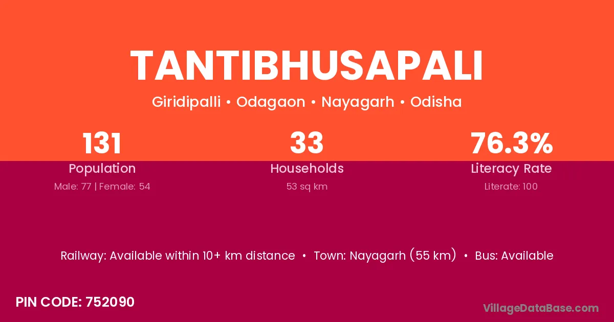 Nayagarh (55 km) is the nearest town to Tantibhusapali village for major economic activities and is located approximately 55 km away.