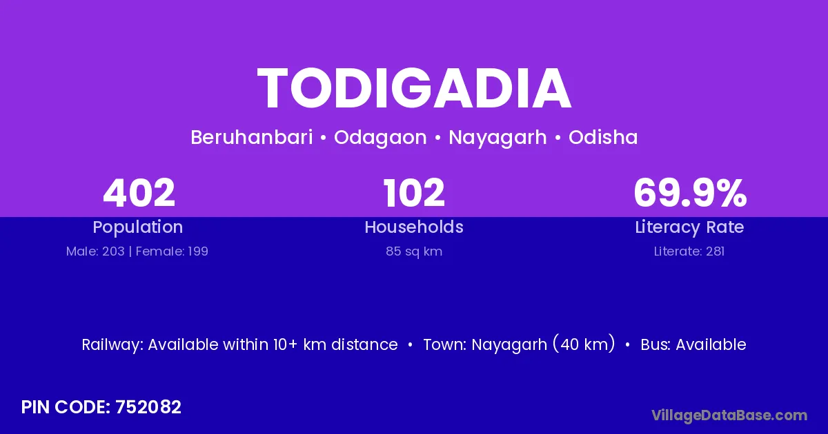 Nayagarh (40 km) is the nearest town to Todigadia village for major economic activities and is located approximately 40 km away.