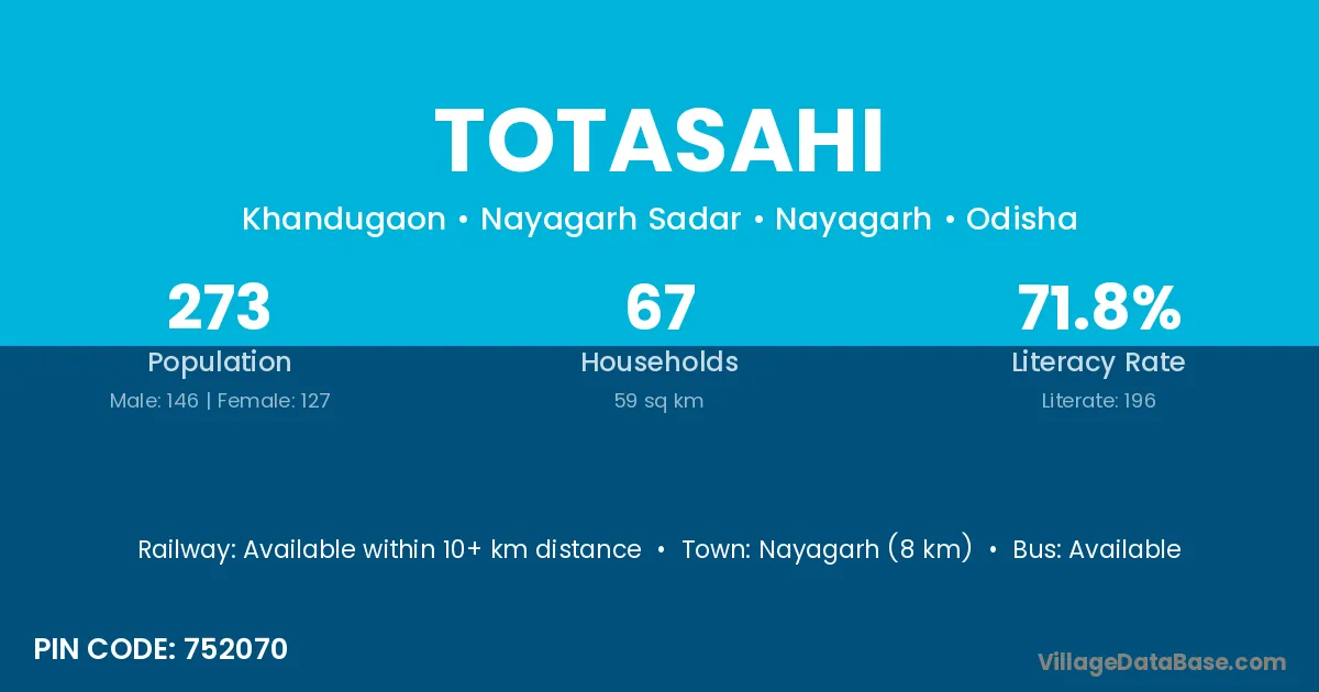 Nayagarh (38 km) is the nearest town to Totasahi village for major economic activities and is located approximately 38 km away.