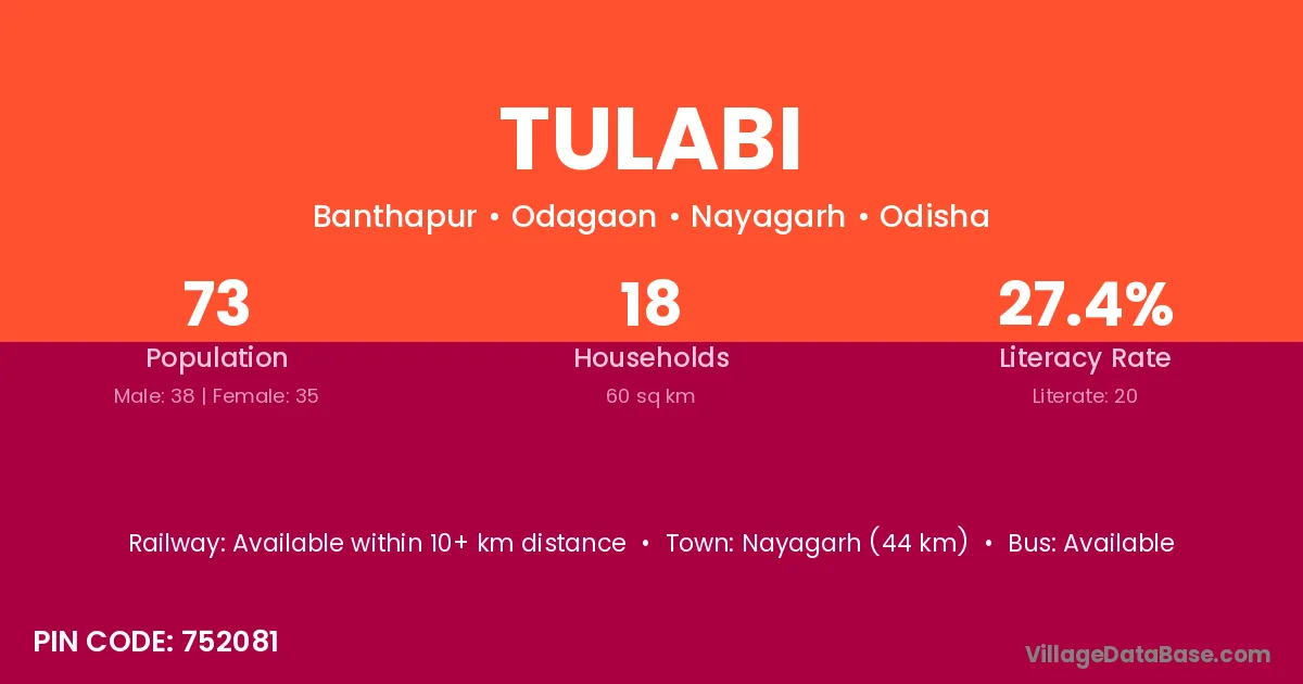 Nayagarh (44 km) is the nearest town to Tulabi village for major economic activities and is located approximately 44 km away.