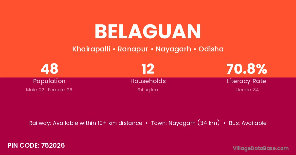 Nayagarh (34 km) is the nearest town to Belaguan village for major economic activities and is located approximately 34 km away.