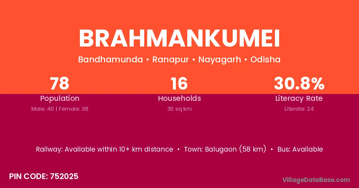 Brahmankumei village has a total population of 78 people, of which 40 are males and 38 are females.