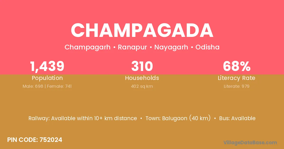 Balugaon (40 km) is the nearest town to Champagada village for major economic activities and is located approximately 40 km away.