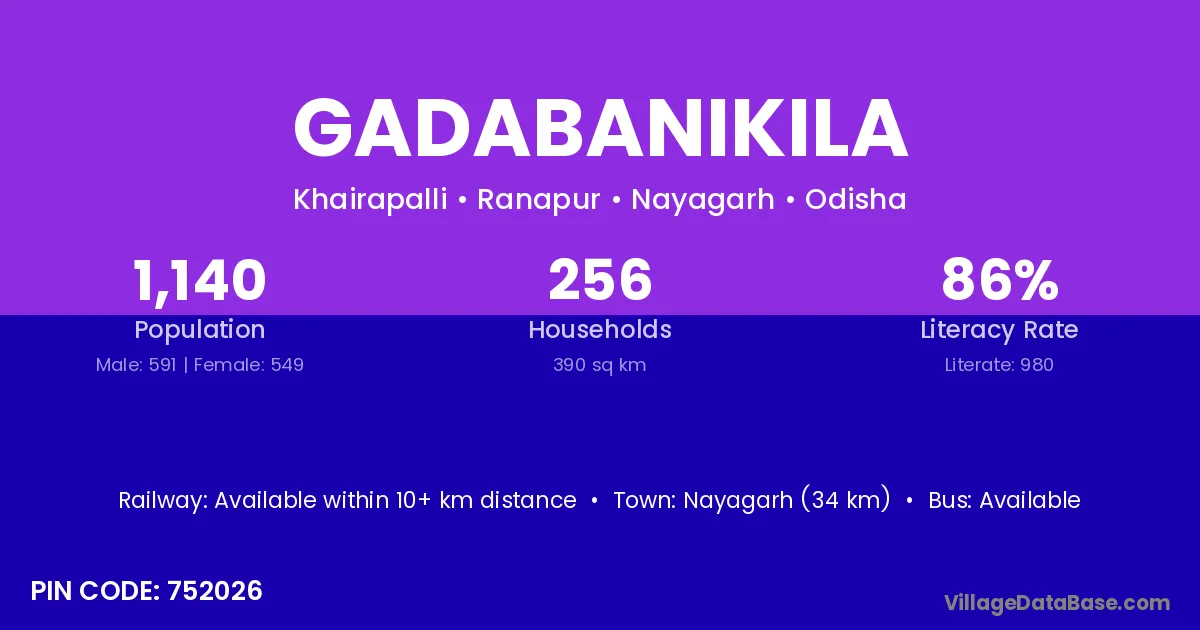 Nayagarh (34 km) is the nearest town to Gadabanikila village for major economic activities and is located approximately 34 km away.