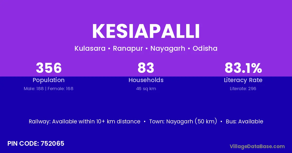 Nayagarh (50 km) is the nearest town to Kesiapalli village for major economic activities and is located approximately 50 km away.