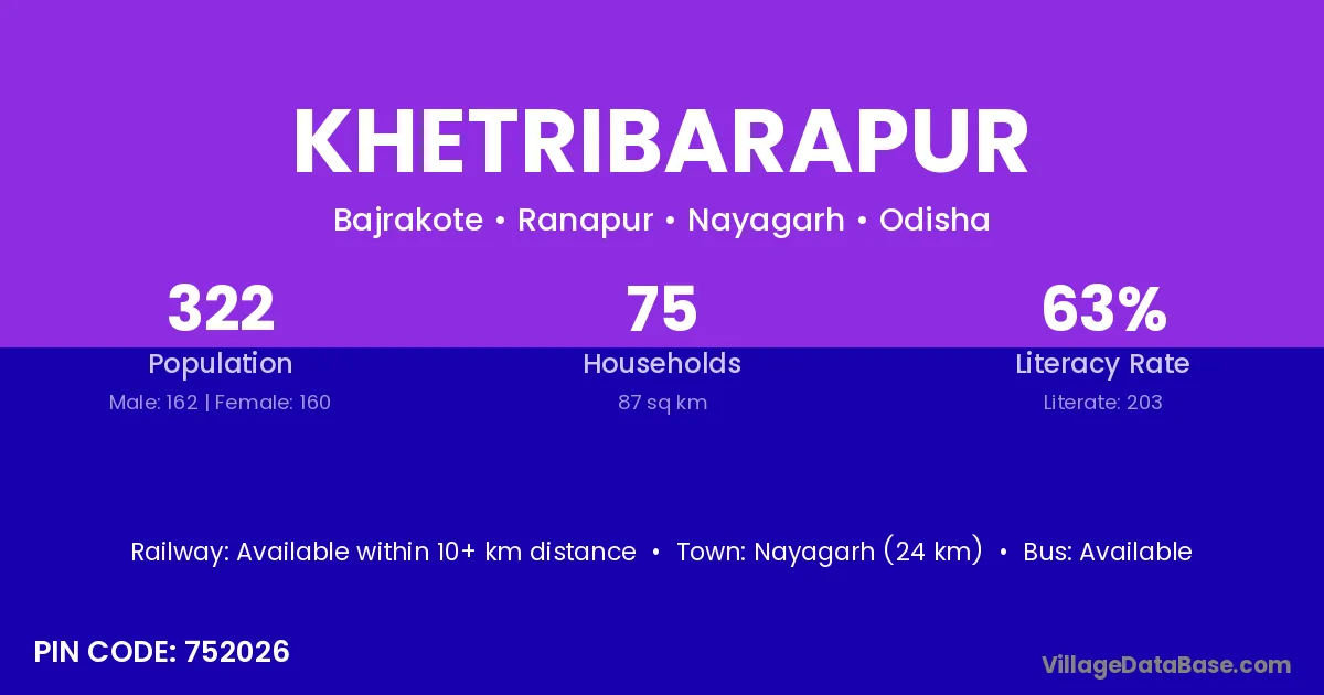 Nayagarh (24 km) is the nearest town to Khetribarapur village for major economic activities and is located approximately 24 km away.