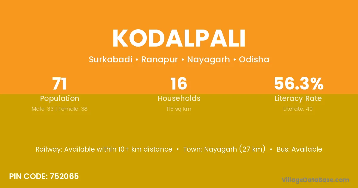 Nayagarh (27 km) is the nearest town to Kodalpali village for major economic activities and is located approximately 27 km away.