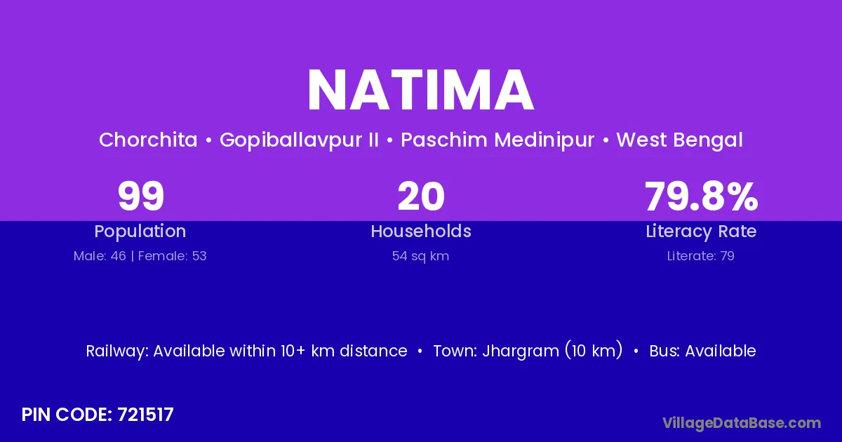 Nayagarh (44 km) is the nearest town to Natima village for major economic activities and is located approximately 44 km away.
