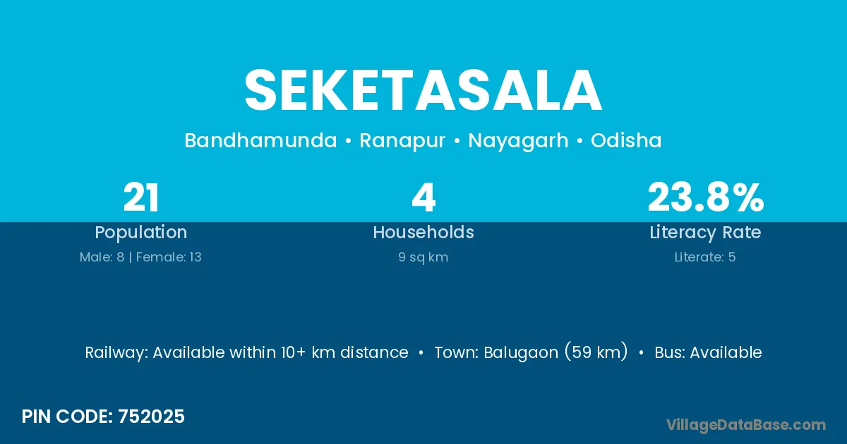 Seketasala village has a total population of 21 people, of which 8 are males and 13 are females.