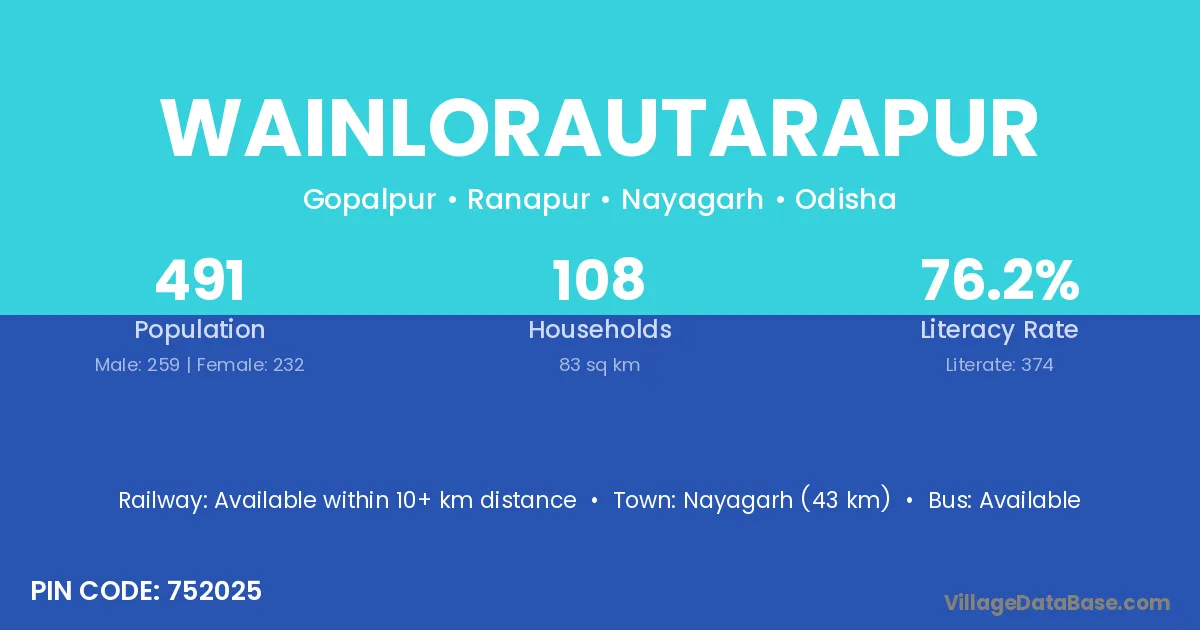 Nayagarh (43 km) is the nearest town to Wainlorautarapur village for major economic activities and is located approximately 43 km away.