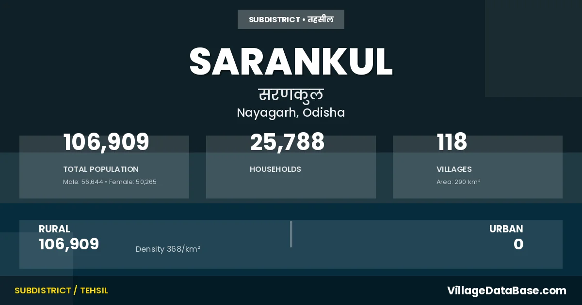 According to the 2011 census The total area of Sarankul Tehsil is 290 km², with a population of 106909 people. The population density is 368 inhabitants per square kilometre, and there are approximately 25788 houses in the sub district.