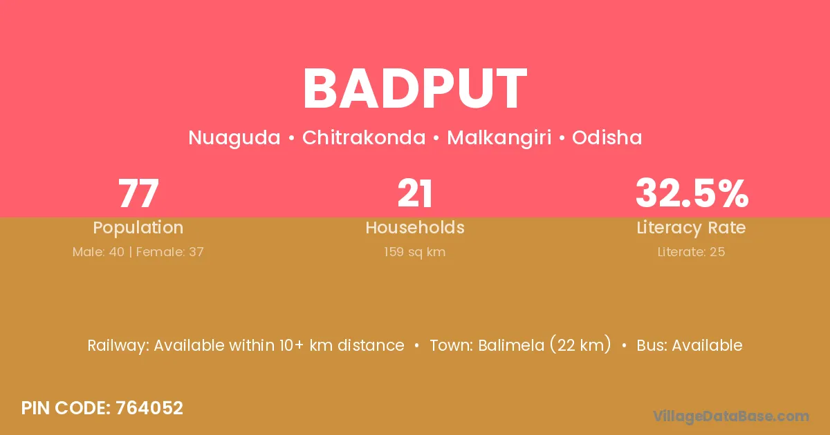 Nayagarh (16 km) is the nearest town to Badput village for major economic activities and is located approximately 16 km away.