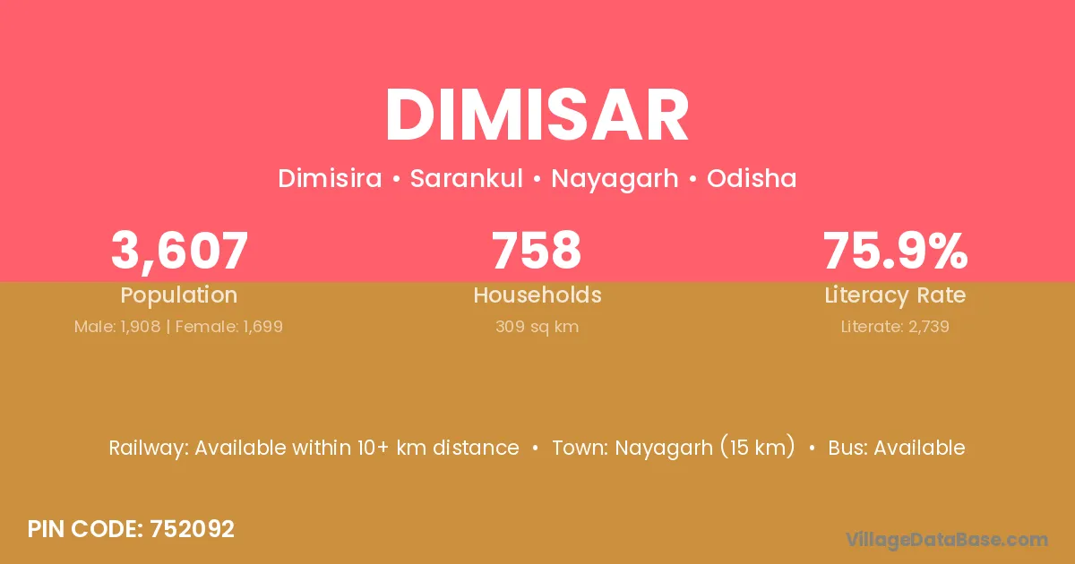 Nayagarh (15 km) is the nearest town to Dimisar village for major economic activities and is located approximately 15 km away.