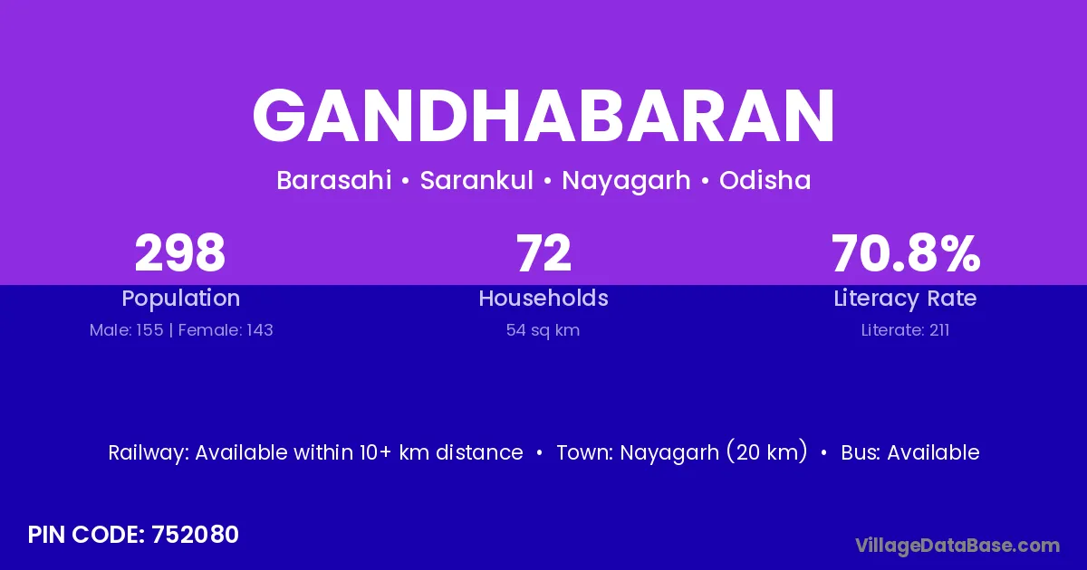 Nayagarh (20 km) is the nearest town to Gandhabaran village for major economic activities and is located approximately 20 km away.