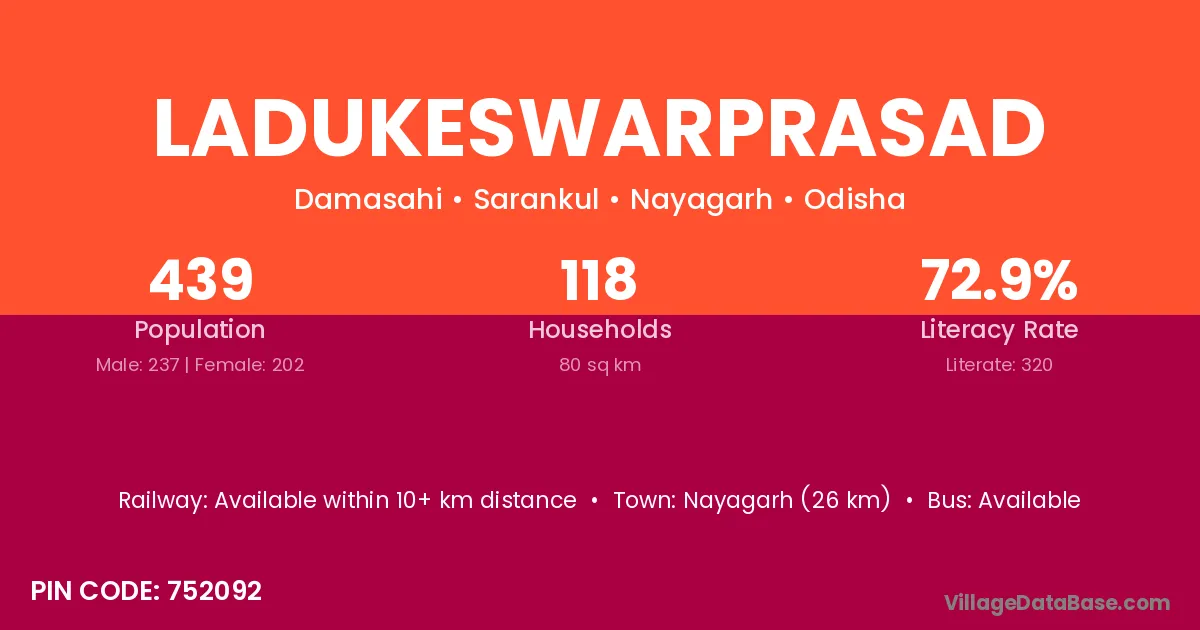 Nayagarh (26 km) is the nearest town to Ladukeswarprasad village for major economic activities and is located approximately 26 km away.