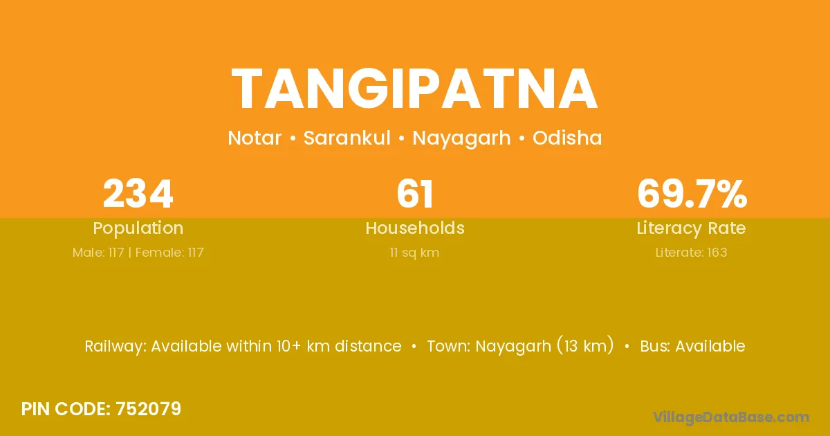 Tangipatna village has a total population of 234 people, of which 117 are males and 117 are females.