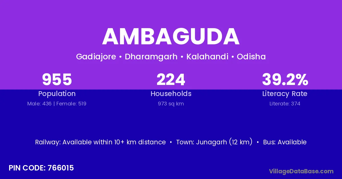 Khariar Road (33 km) is the nearest town to Ambaguda village for major economic activities and is located approximately 33 km away.