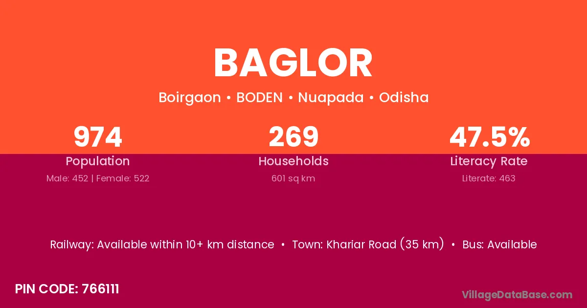 Khariar Road (35 km) is the nearest town to Baglor village for major economic activities and is located approximately 35 km away.