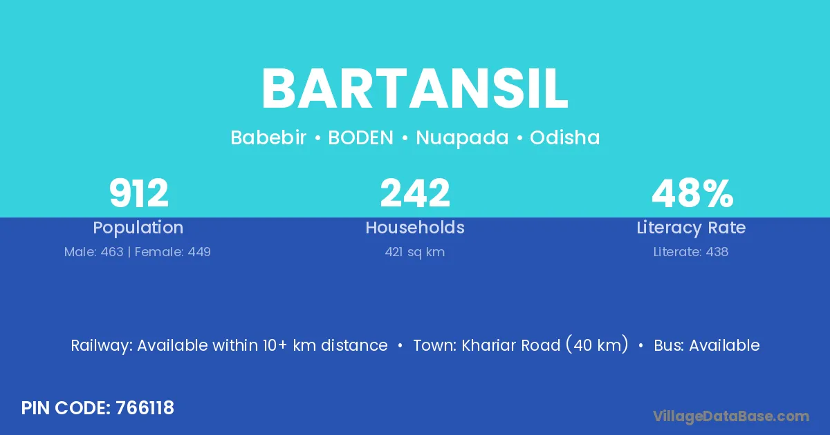 Khariar Road (40 km) is the nearest town to Bartansil village for major economic activities and is located approximately 40 km away.