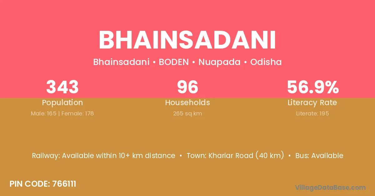 Khariar Road (40 km) is the nearest town to Bhainsadani village for major economic activities and is located approximately 40 km away.