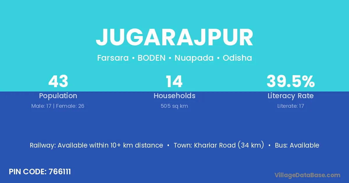 Khariar Road (34 km) is the nearest town to Jugarajpur village for major economic activities and is located approximately 34 km away.