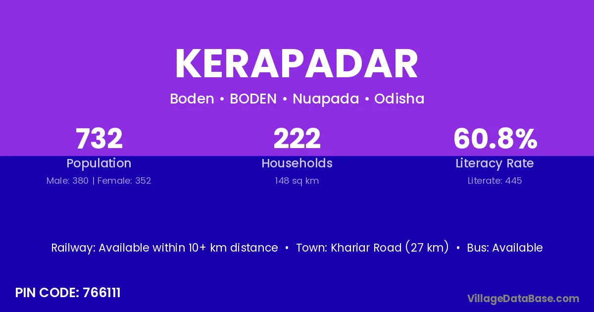 Khariar Road (27 km) is the nearest town to Kerapadar village for major economic activities and is located approximately 27 km away.