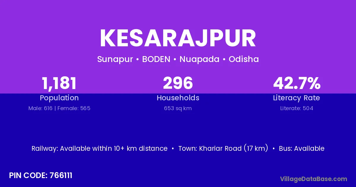 Khariar Road (17 km) is the nearest town to Kesarajpur village for major economic activities and is located approximately 17 km away.
