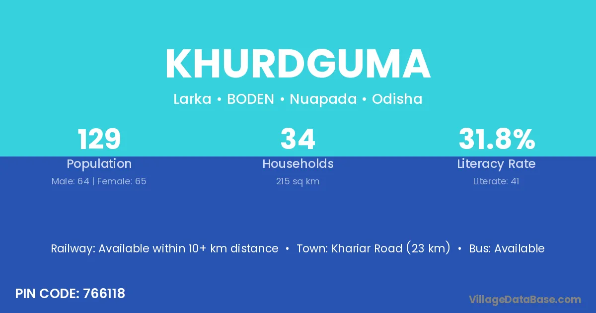 Khariar Road (23 km) is the nearest town to Khurdguma village for major economic activities and is located approximately 23 km away.