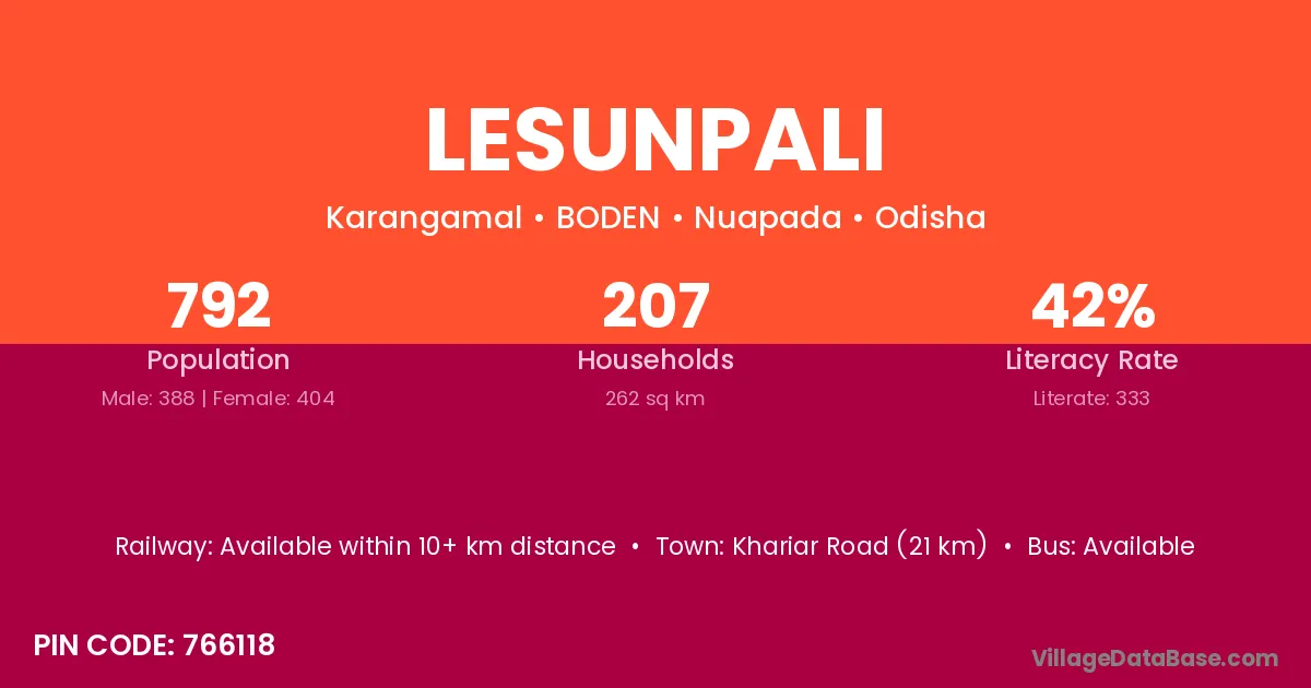 Khariar Road (21 km) is the nearest town to Lesunpali village for major economic activities and is located approximately 21 km away.