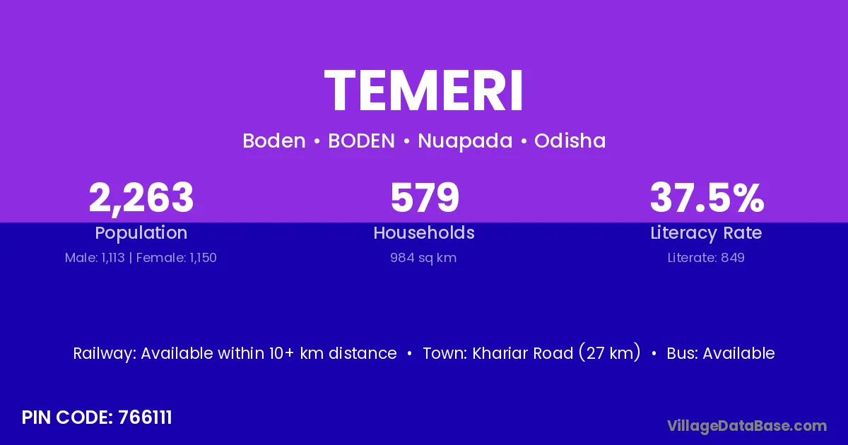 Khariar Road (27 km) is the nearest town to Temeri village for major economic activities and is located approximately 27 km away.