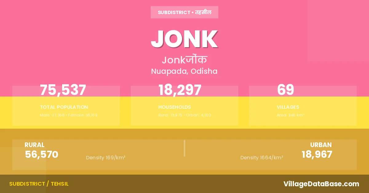 JONK is a town and Tehsil in the Nuapada district of the Odisha. In India, a Tehsil is a subdivision of a district responsible for the administration and revenue collection of a specific area within the district. Tehsils play a crucial role in the local governance structure, contributing significantly to the development and administration of their communities.