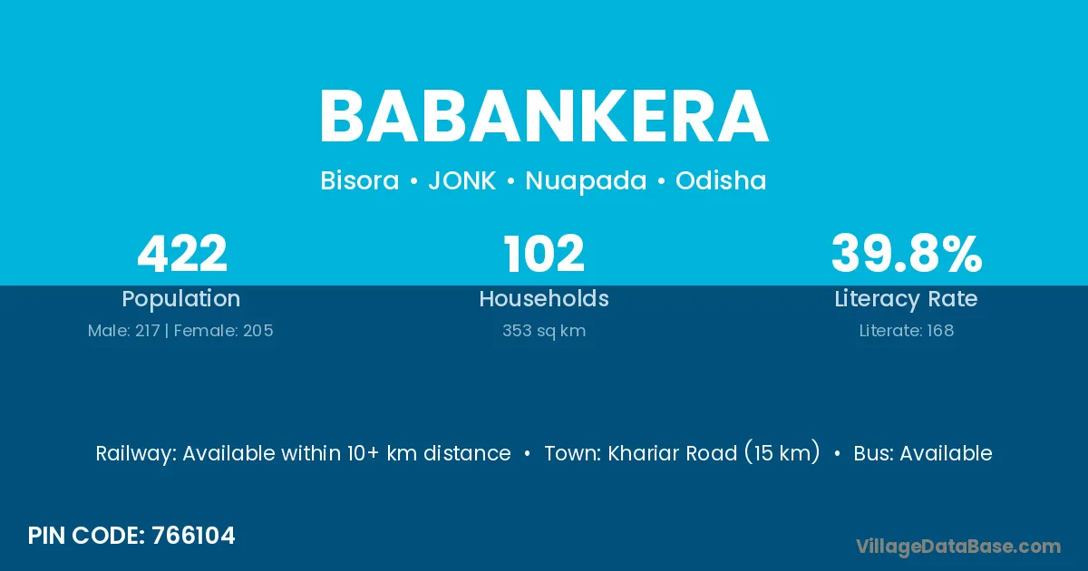 Khariar Road (15 km) is the nearest town to Babankera village for major economic activities and is located approximately 15 km away.