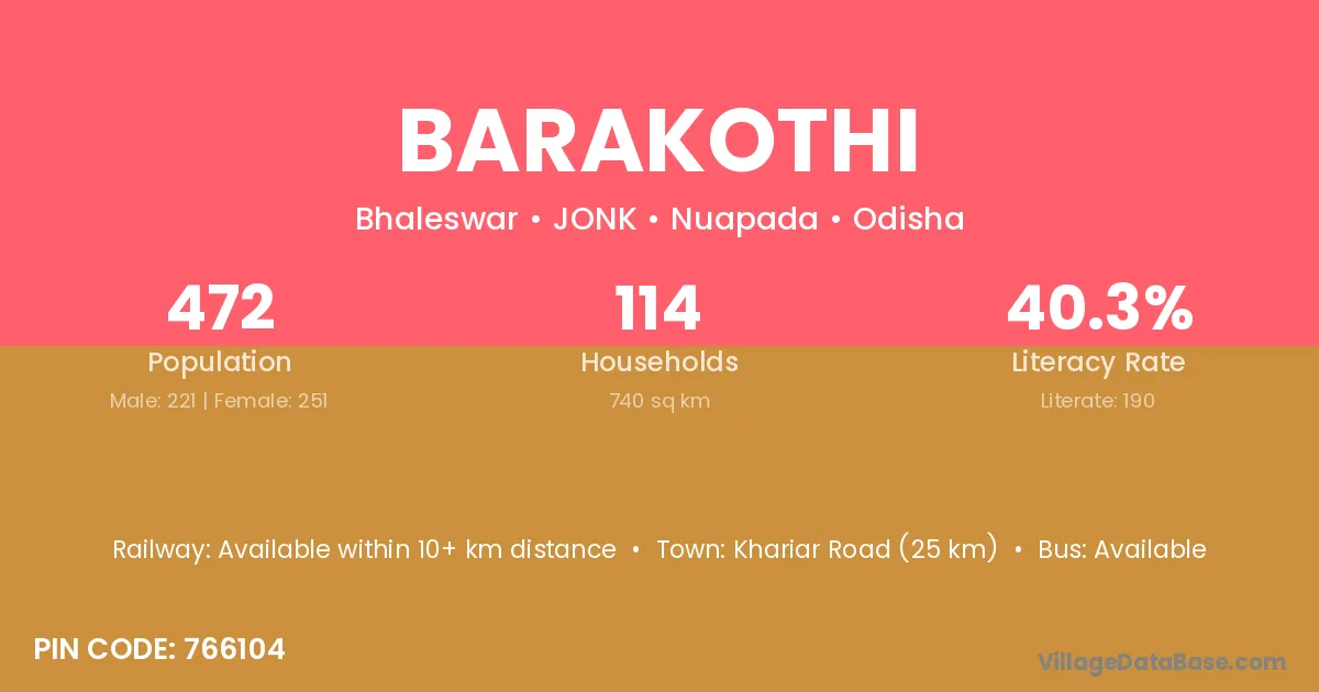 Khariar Road (25 km) is the nearest town to Barakothi village for major economic activities and is located approximately 25 km away.