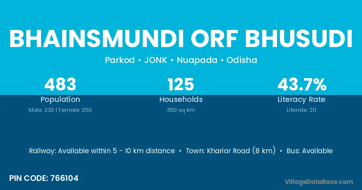 Bhainsmundi Orf Bhusudi village has a total population of 483 people, of which 233 are males and 250 are females.