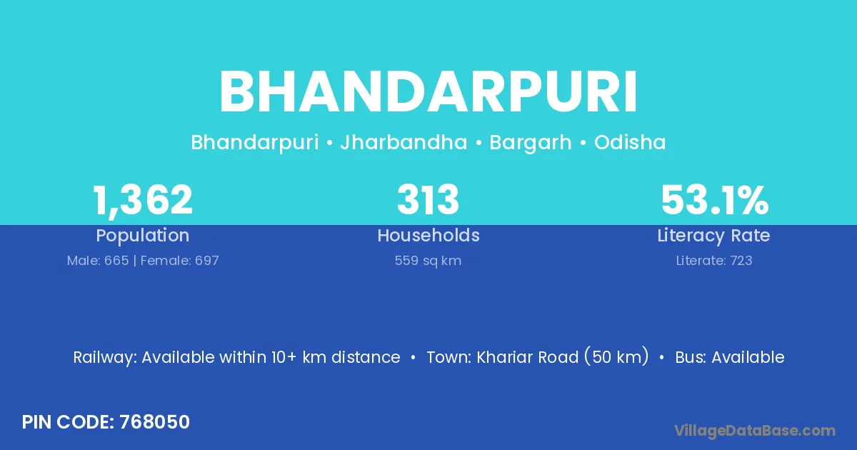 Khariar Road (8 km) is the nearest town to Bhandarpuri village for major economic activities and is located approximately 8 km away.