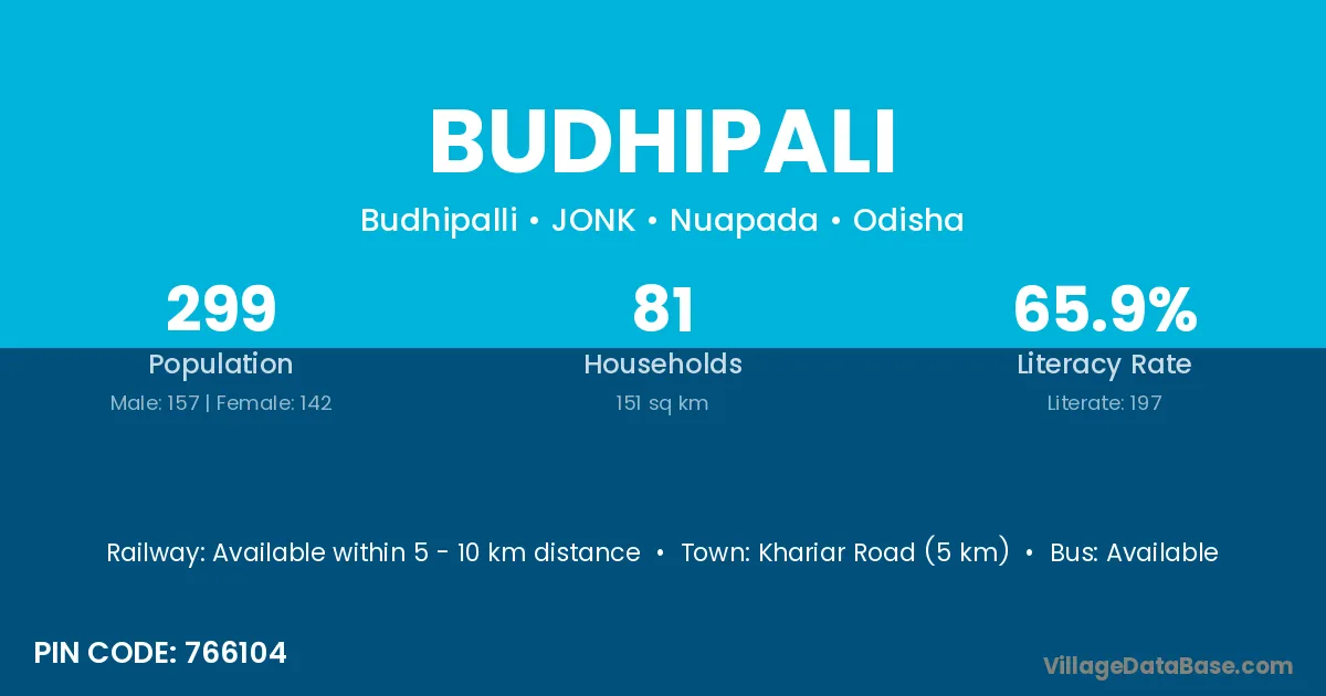 Khariar Road (5 km) is the nearest town to Budhipali village for major economic activities and is located approximately 5 km away.