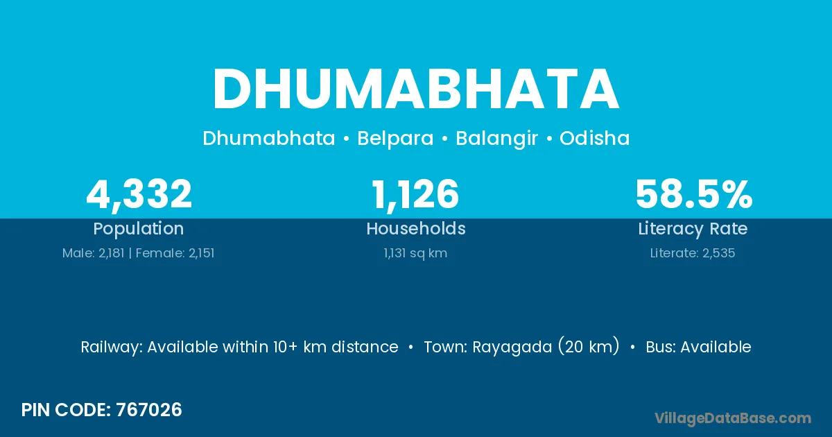 Khariar Road (15 km) is the nearest town to Dhumabhata village for major economic activities and is located approximately 15 km away.