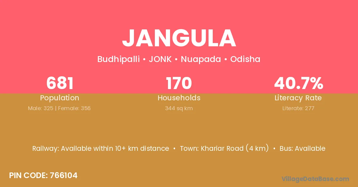 Khariar Road (4 km) is the nearest town to Jangula village for major economic activities and is located approximately 4 km away.